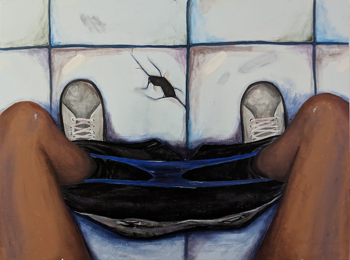 Description: This is inspired by a poem written by a student in our writing class. It describes overhearing people gossip about you in the bathroom when they don't know you in a stall. My idea was to create the painting from their perspective but also to illustrate an uncomfortable and invasive feeling.